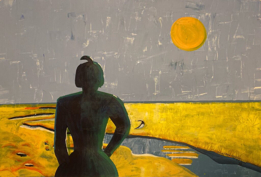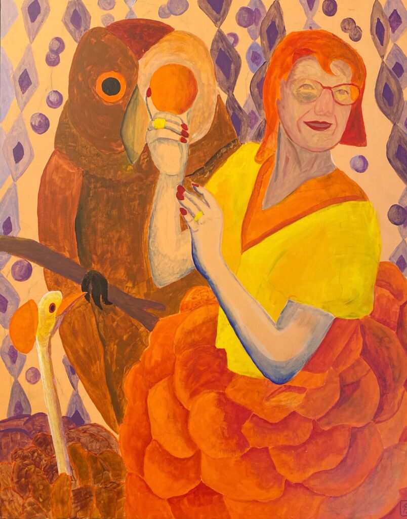 Fragende vor Eule in Orange, 50×60, 2025
