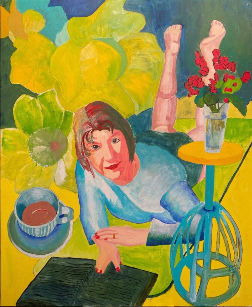 Lesende mit Kaffeetasse in Grün, 50×60, 2025