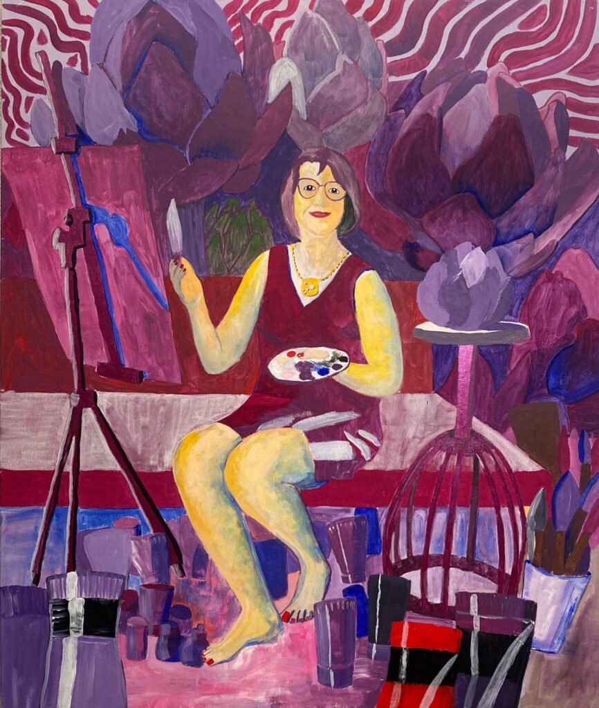 Malende mit Artischocke in Violett, 50×60, 2025